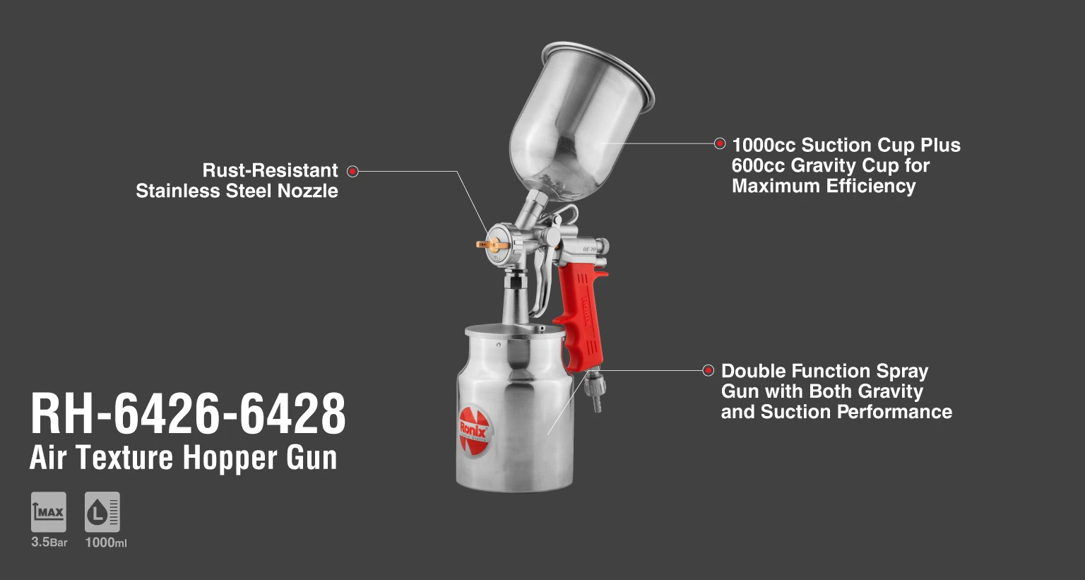 به علاوه، RH-6426-RH-6428نازلهایی با سایز 1.6 و 1.8 دارد و از یک کاسه پایینی با ظرفیت 1000 میلی لیتر و یک کاسه بالایی با ظرفیت 600 میلی لیتر بهره میبرند تا بهترین نتیجه را برای کاربر به ارمغان بیاورند.