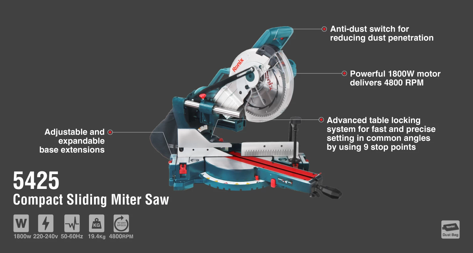 - مجهز به سیستم قفل کن پیشرفته و سریع میز برش در 9 زاویه کاربردی جهت انجام برش های بازویی و میزی با نهایت دقت
