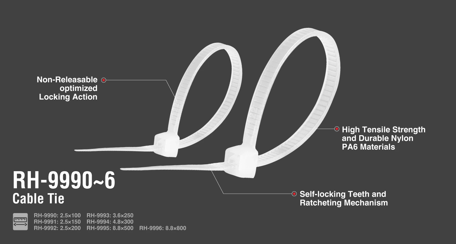 بست کمربندی RH-9994 رونیکس، از نایلون PA6 پلی کاپرولاکتام با حداکثر استحکام کششی 22 کیلوگرم ساخته شده است. از این محصول در خانهها، دفاتر، کارگاهها، انبارها و ... برای دستهبندی کابلها و بستهبندی مواد و قطعات مختلف استفاده میشود. همچنین، عملکرد بهینهشده قفلشوندگی این بست کمربندی موجب ایجاد اتصالات دائمی میشود.