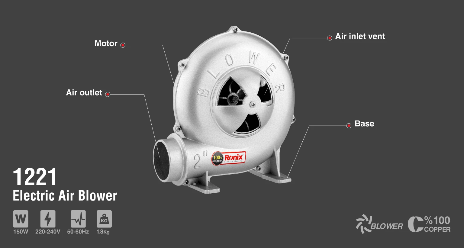 دم برقی 2 اینچ رونیکس مدل 1221، برای تولید باد با حجم بالا مورد استفاده قرار میگیرد. تولید فشار بالای باد، جریان یکنواخت و پرقدرت هوا، گرمشدن اندک و طراحی ارگونومیک، زیبا و سبکوزن دستگاه، مصرف بهینه انرژی و موتور کمصدا و بدون لغزش با حداکثر توان 150 وات، از ویژگیهای مهم این دستگاه قدرتمند رونیکس هستند.